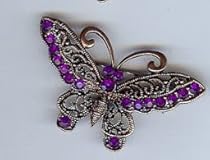 - Victorian Filigree Butterfly Brooch in Antique Copper Finish with Purple Stones. Also available with green stones. 1.5" tall and 2.5" wide at the widest part of the wing span. Costume Quality Jewelry for a lavish, yet inexpensive finishing costume touch!